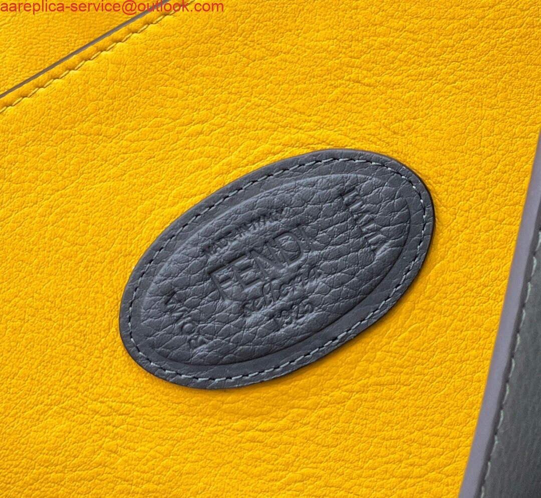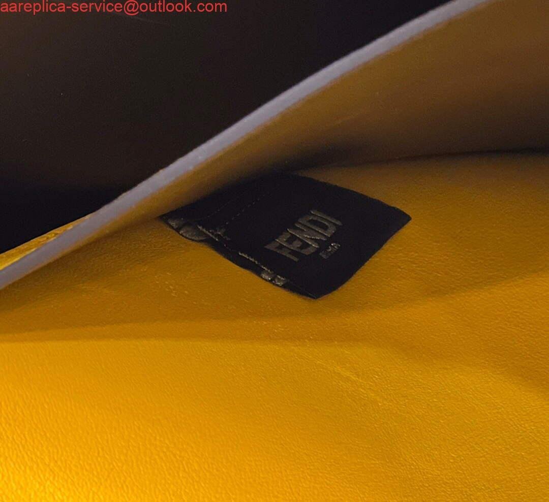 Interior organised with two compartments divided by a stiff partition. featuring the iconic twist lock on the front and zip fastening on the back. The removable interior pocket is made of yellow leather on one side and FF fabric on the other. Palladium-finish metalware.