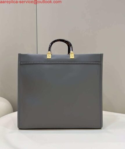 Medium Sunshine Shopper bag in silver laminated leather with hot-stamped graduated FENDI ROMA motif and tortoiseshell-effect plexiglass rigid handles.