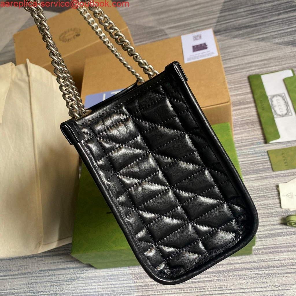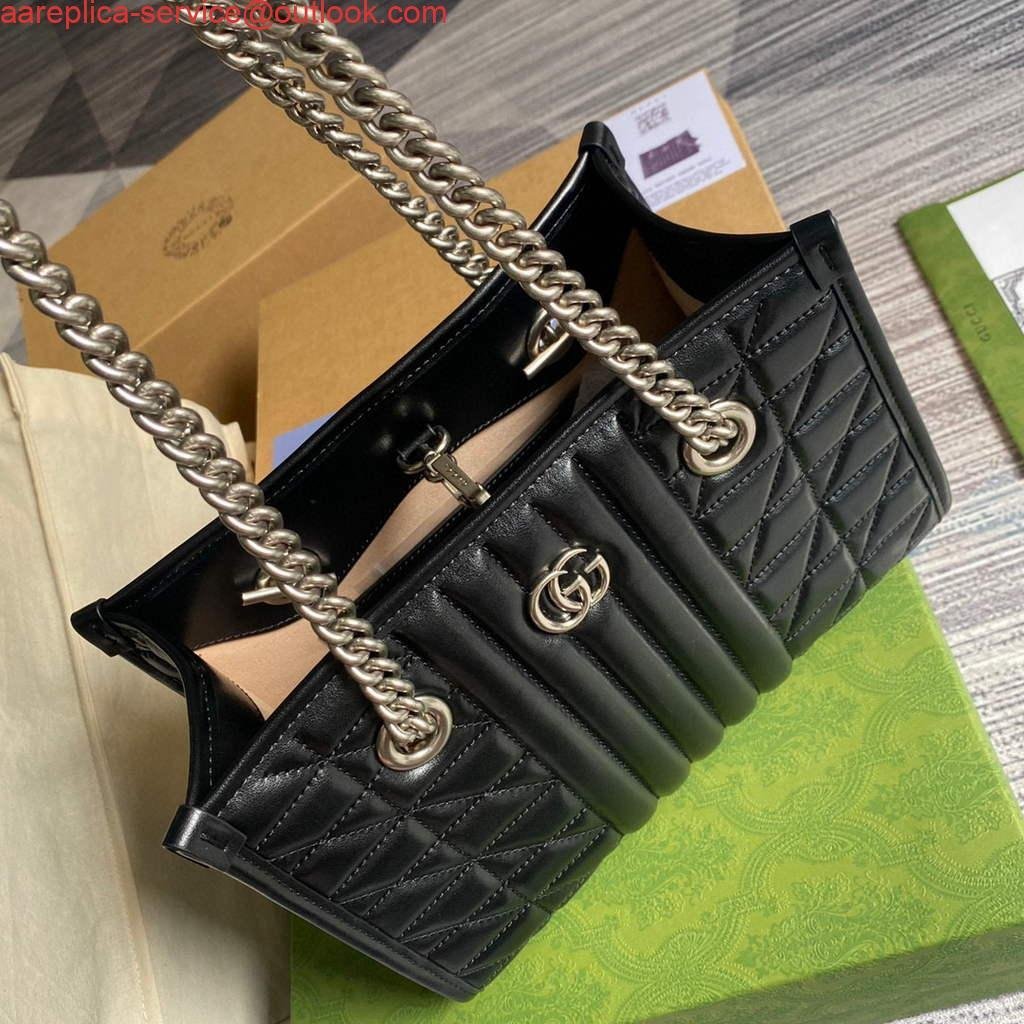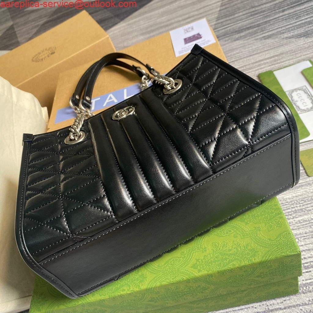 Gucci Aria explores the House’s archives. telling Gucci’s story though a mix of archival and contemporary elements. The GG Marmont was introduced in one of the Creative Director’s first fashion shows and each season its design evolves through the lens of the latest collection. Here. the tote bag is presented in black matelassu00e9 leather with antique silver-toned hardware.
