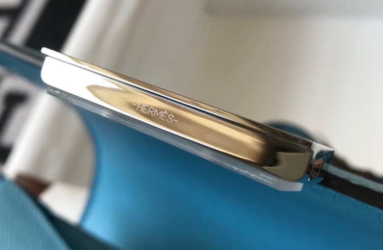 The contours of the H-shaped clasp curve gently into the cut-out of the flap; the secret of the Constance is its perfect roundedness.