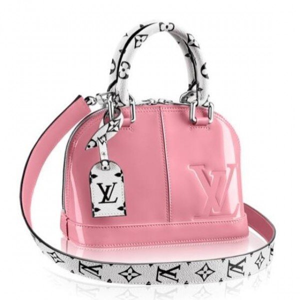 Louis Vuitton LV Alma BB Bag Patent Leather M54704 BLV666. For Fall 2017. the House continues to reveal new facets of Vernis leather with an unexpected reinterpretation of one of Louis Vuitton??s most iconic shapes: the Alma BB. The audacious color and Monogram canvas trim gives it a stunningly disruptive feel.
