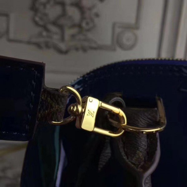 Louis Vuitton LV Alma BB Bag Patent Leather M54705 BLV667. For Fall 2017. the House continues to reveal new facets of Vernis leather with an unexpected reinterpretation of one of Louis Vuitton??s most iconic shapes: the Alma BB. The audacious color and Monogram canvas trim gives it a stunningly disruptive feel.