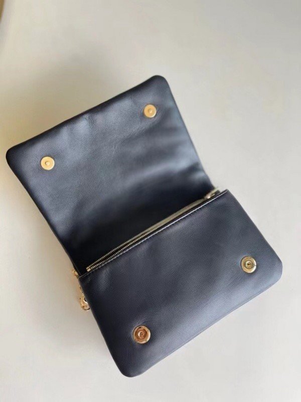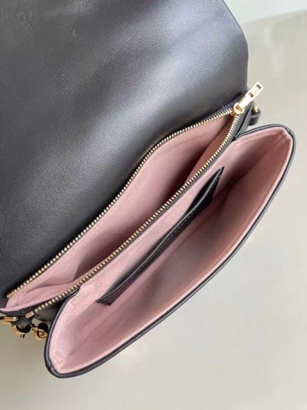 Louis Vuitton LV Black Coussin Pochette Bag M80742 BLV703. The Pochette Coussin is crafted from soft lambskin. which is embossed with the Monogram pattern to create a puffy. cushiony effect. This is further enhanced by the construction of the pouch. which gives it a supple. body-friendly shape. The removable chain. decorated with a Louis Vuitton charm. offers different carry options: clutch. shoulder or belt.