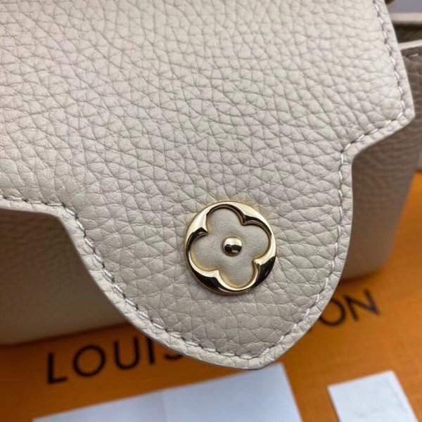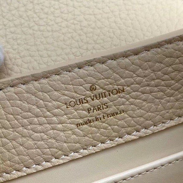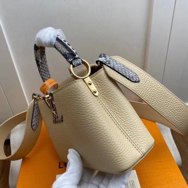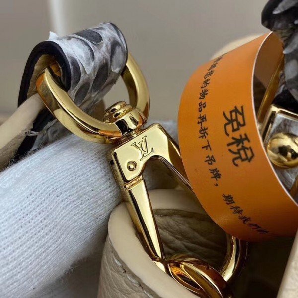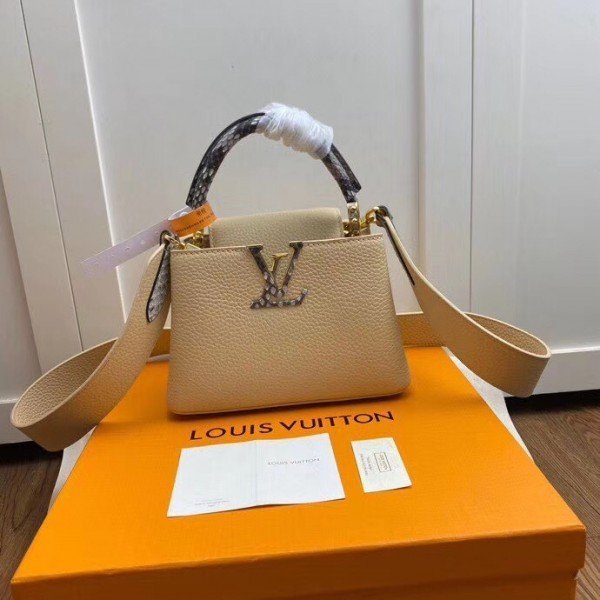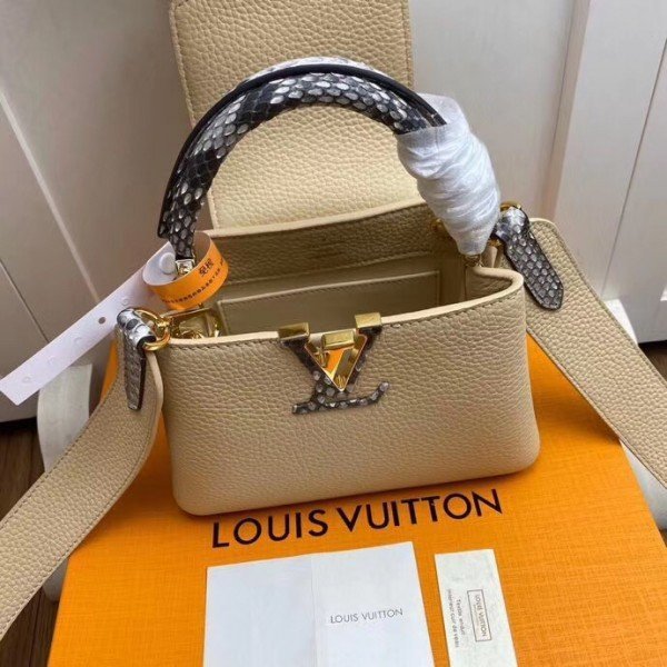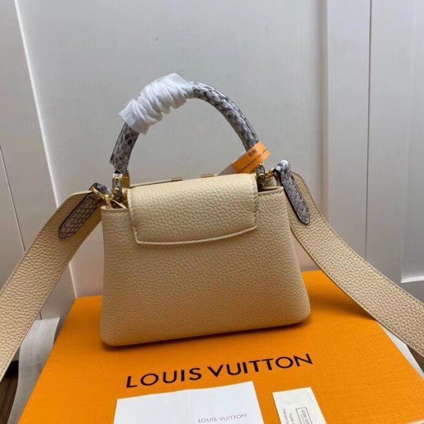 Louis Vuitton LV Capucines Mini With Ayers Snakeskin Handle M55923 BLV668. The Capucines Mini handbag looks elegant for spring. dressed in a rainbow of fresh pastel shades. This feminine model combines Taurillon leather with a handle and LV signature covered in precious Ayers snakeskin. a contrast that beautifully underscores the bag??s pure lines. Fitted with a detachable leather strap for shoulder carry or cross-body wear.