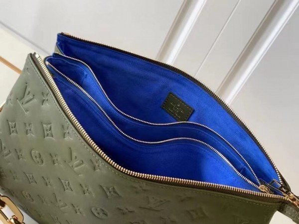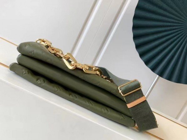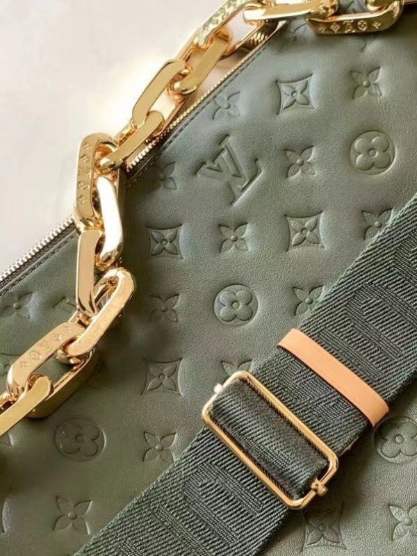 Louis Vuitton LV Coussin MM Bag Monogram Lambskin M57782 BLV717. The most eye-catching bag of the Spring-Summer 2021 collection. the Coussin MM handbag is fashioned from puffy lambskin. embossed with a Monogram pattern. Voluminous. soft. and supple. the bag almost feels like a pillow. An adjustable leather strap allows shoulder and a cross-body carry. while the new Edge Chain. enables under-arm and baguette carry.