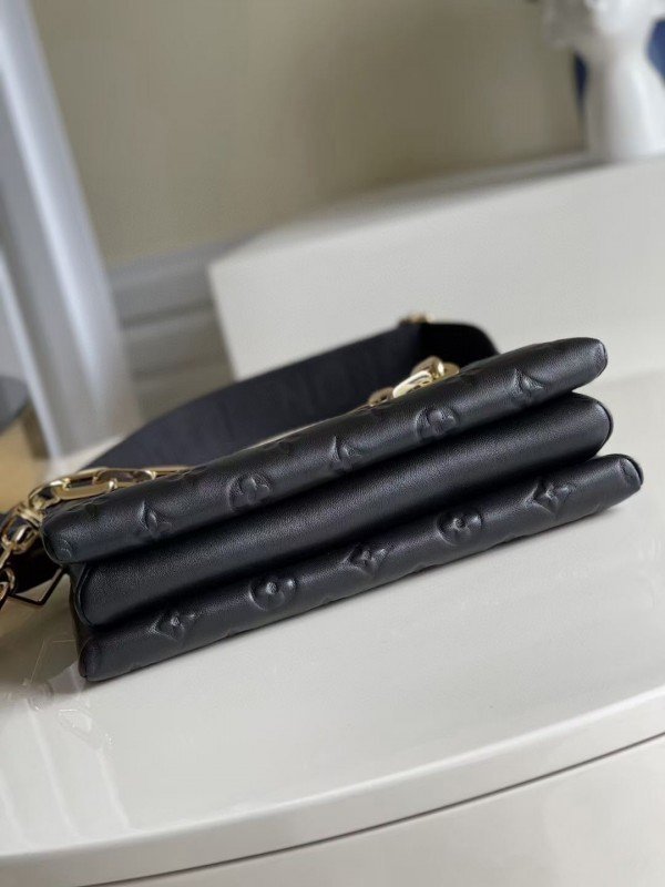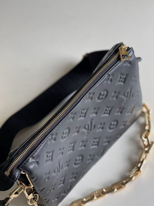 Louis Vuitton LV Coussin PM Bag Monogram Lambskin M57790 BLV721. One of the stars of the Spring-Summer 2021 show. the Coussin PM handbag is made from Monogram-embossed puffy lambskin. It can be worn cross-body with the strap. as a chain baguette. or comfortably carried under the arm. The pillow-like Coussin bag brings style to the most simple look. giving it an effortless fashion-forward allure.