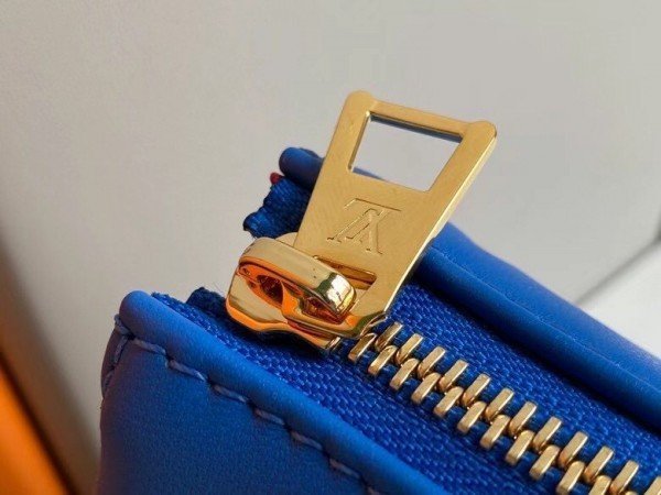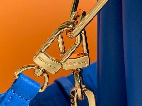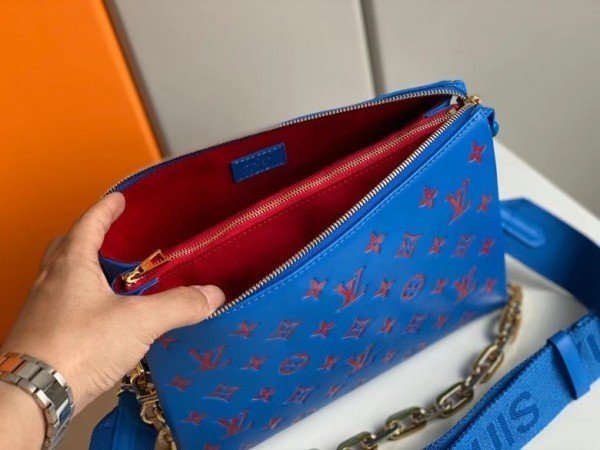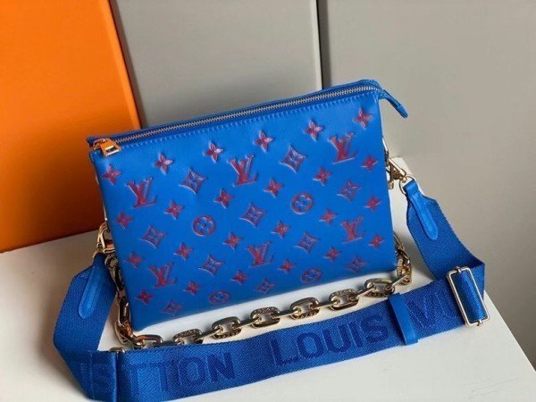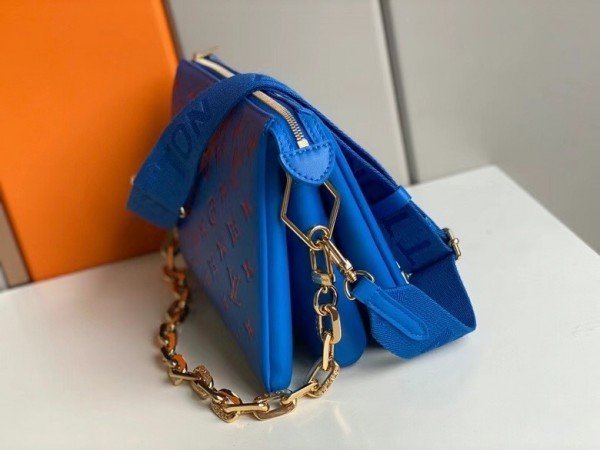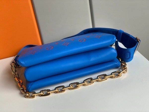 Louis Vuitton LV Coussin PM Bag Monogram Lambskin M58626 BLV705. Fashioned from puffy lambskin and accessorized with a chunky gold-color chain. this Coussin PM handbag is part of the Vuittamins capsule collection. Its bright vibrant colorway is Nicolas Ghesqui??re??s translation of the joy and audacity of women. The Coussin can be worn cross-body with the strap. as a chain baguette. or carried under the arm.