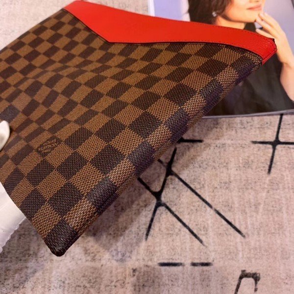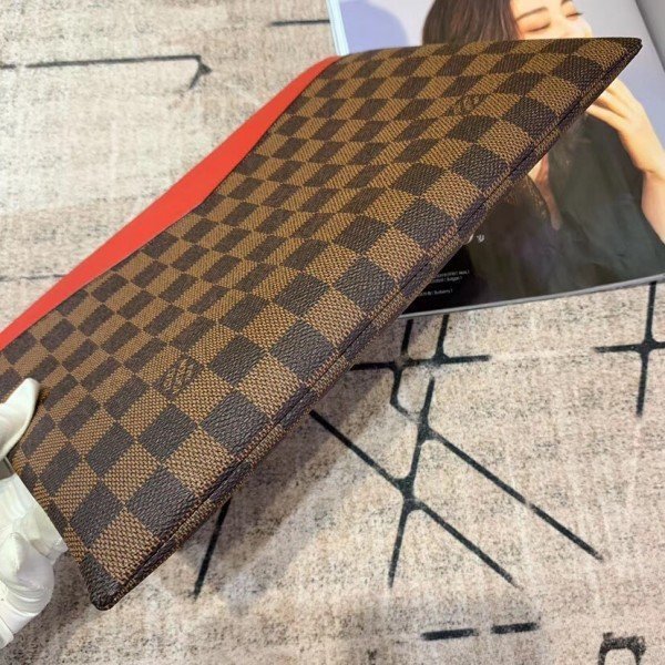 Louis Vuitton LV Daily Pouch Damier Ebene N60262 BLV097. Subtly grained cowhide leather combines with graphic Damier Ebene canvas. for a Daily Pouch that is both practical and chic. The zip closure ?C accented with leather pulls ?C opens wide to reveal a spacious interior. roomy enough for an iPad or other belongings. This stylish hold-all can be carried as a clutch or slipped inside a larger bag.