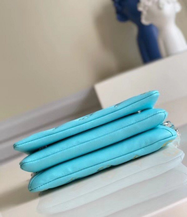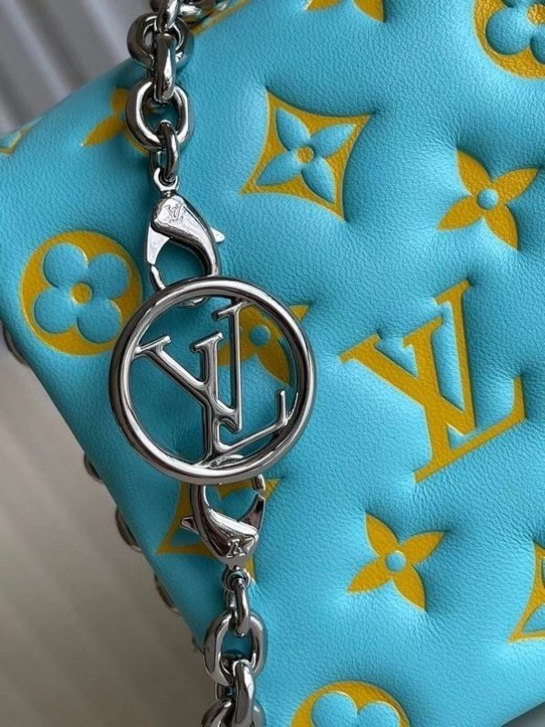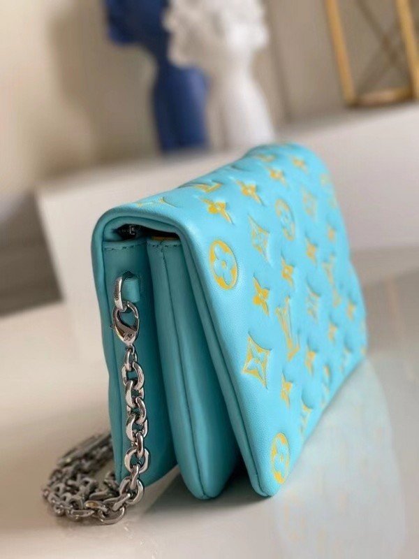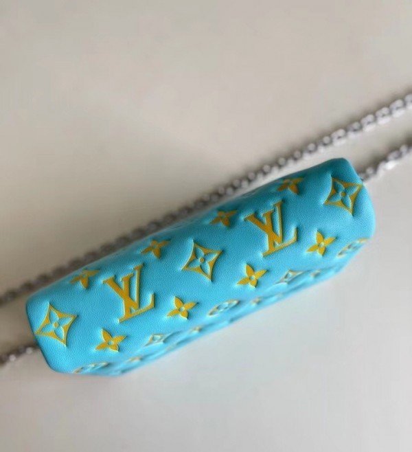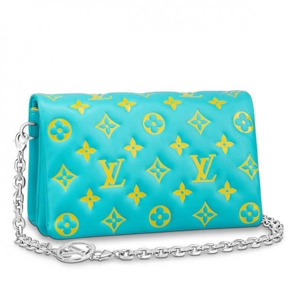 Louis Vuitton  LV Green Coussin Pochette Bag M80744 BLV709. The Pochette Coussin is crafted from soft lambskin. which is embossed with the Monogram pattern to create a puffy. cushiony effect. This is further enhanced by the construction of the pouch. which gives it a supple. body-friendly shape. The removable chain. decorated with a Louis Vuitton charm. offers different carry options: clutch. shoulder or belt.