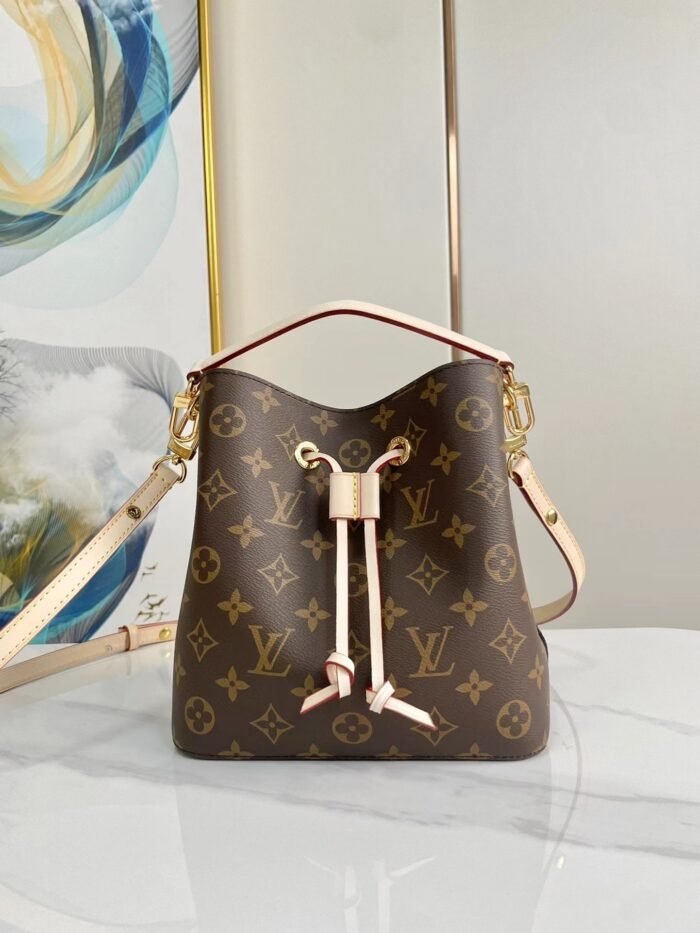 Replica A true House icon, the NéoNoé bucket bag revisits a 1932 design by Gaston-Louis Vuitton. The original was created to transport bottles of Champagne in style; this modern version in Monogram canvas features a sleek shape, colorful leather trim and a matching bonded lining. The adjustable smart strap can be slung over the shoulder or lengthened for a trendy cross-body carry.