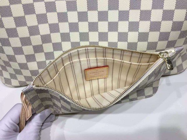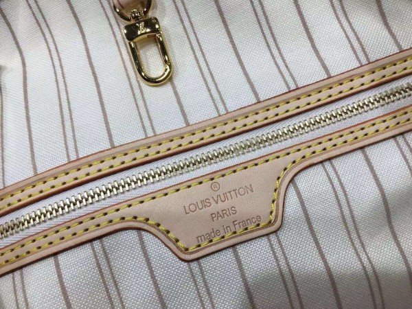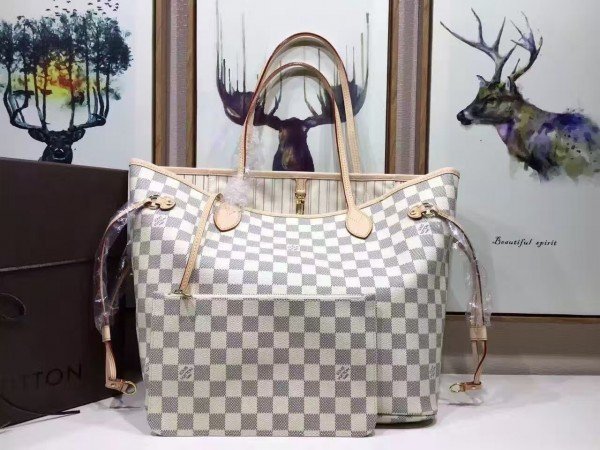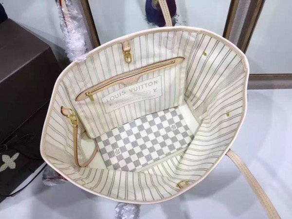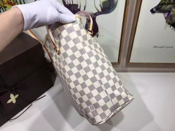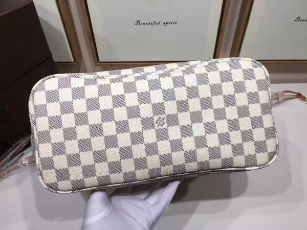 Louis Vuitton LV Neverfull MM Bag Damier Azur N41361 BLV055. Legendary Neverfull: always exactly what you need it to be. Capacious but not bulky. structured yet supple. at home on the town or in the country. Cinch the side laces. and voil??! it??s a sleek city bag. Loosen them and you have a chic. practical tote. The slim leather handles fit over the shoulder or on the arm.