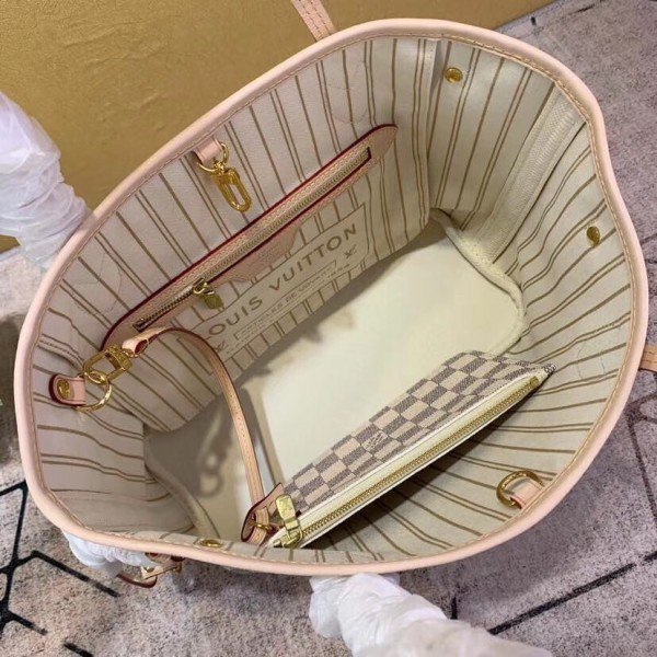 Louis Vuitton LV Neverfull PM Bag Damier Azur N41362 BLV032. The Neverfull PM tote pairs timeless design with heritage details. Crafted from Damier Azur canvas with natural cowhide trim. it is capacious yet not bulky. with side laces that cinch for a sleek allure or loosen for a casual look. Slim. comfortable handles slip easily over the shoulder or arm. Lined in colorful textile. it features a removable pouch which can be used as a clutch or an extra pocket.