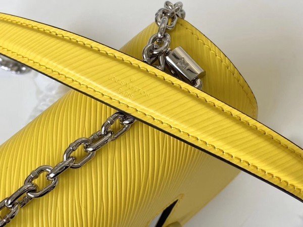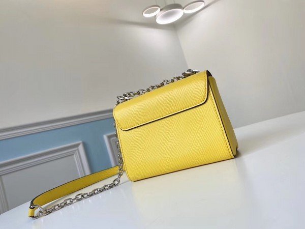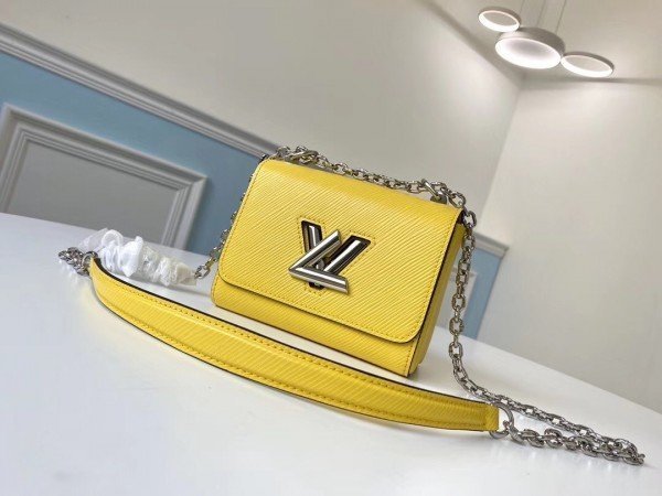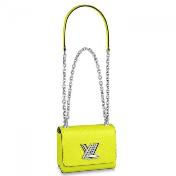 Louis Vuitton LV Twist Mini Bag Epi Leather M56119 BLV141. The Twist Mini handbag. with its modern interpretation of the classic LV Twist lock. is made from Epi grained leather with a sliding silver-tone chain. The new mini-version of the iconic Twist design is perfect for a day-to-evening use. Its ingeniously designed wave base expands to store extra necessities
