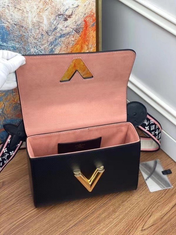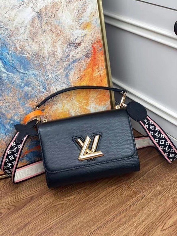Louis Vuitton  LV Twist MM Bag Epi Leather M57050 BLV179. This Twist MM handbag in black Epi leather boasts a wide embroidered strap with a leather Monogram Flower at its base. In black. cream and soft pink. the strap features a mini Monogram pattern on one side and ‘Louis Vuitton’ on the other. There is a removable top handle for hand carry.
