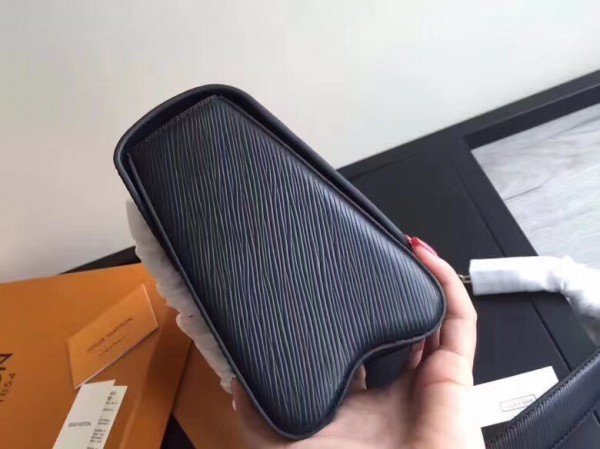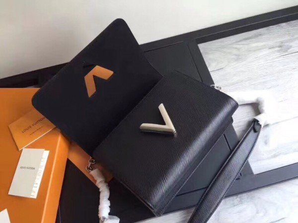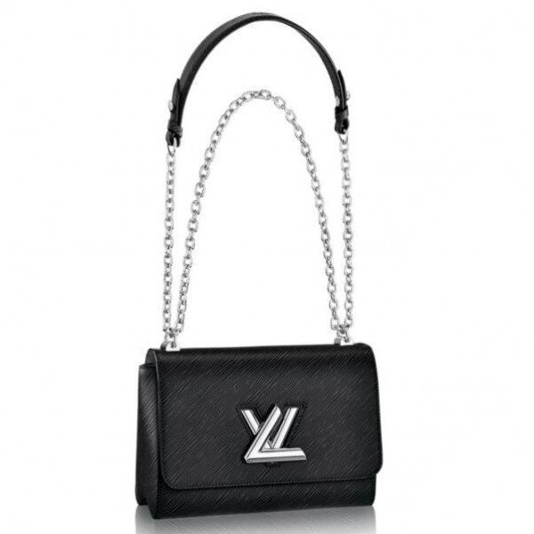 Louis Vuitton LV Twist MM Bag In Black Epi Leather M50282 BLV207. This chic little bag has a secret: it??s roomier than it looks. The cleverly designed ??wave?? base provides extra space for storing necessities. The convertible chain handle can be worn cross-body or hung gracefully from the shoulder.