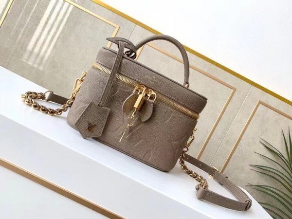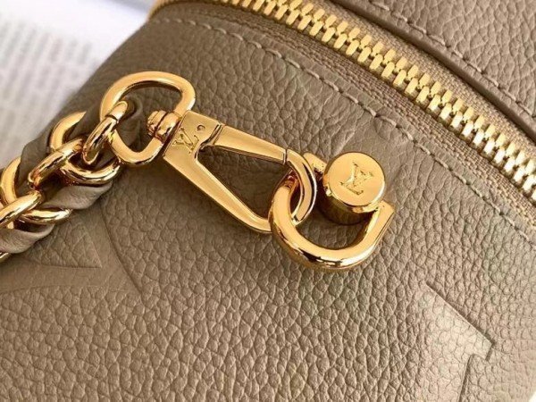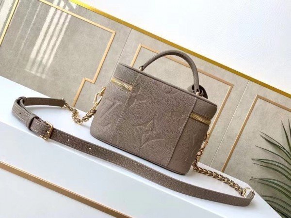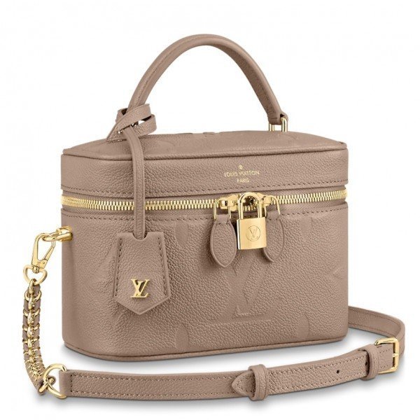 Replica Louis Vuitton LV Vanity PM Monogram Empreinte M45608 BLV520. With its elegantly modern shape. leather top handle. and subtle embossed Giant Monogram pattern. the Vanity PM handbag is the perfect day-to-evening bag. It features two leather-tassel zip pulls for easy opening and a padlock for secure closure. The adjustable and removable leather strap is adorned with a small chain. interwoven with the leather