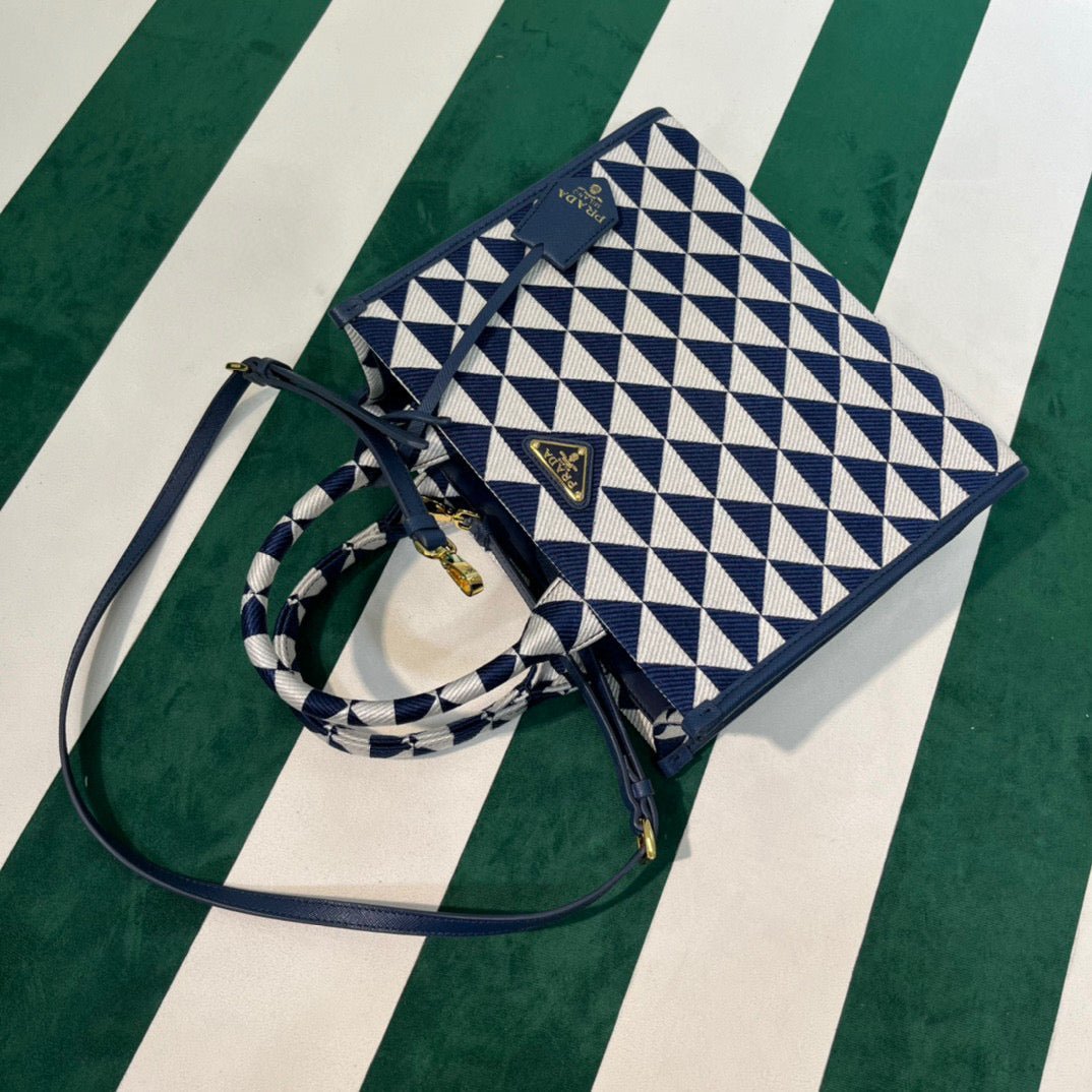 Prada 1BA354 Small Prada Symbole jacquard fabric handbag Blue White on sale now.