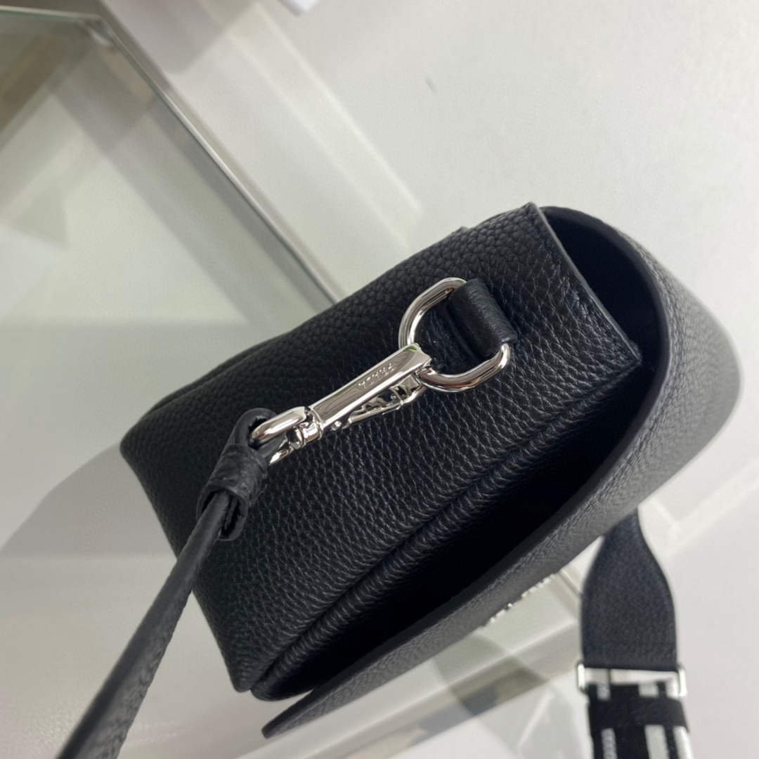 This small leather bag with soft pleated sides and a modern silhouette is decorated with the gold lettering logo on the flap. The adjustable woven tape shoulder strap decorated with the embroidered logo in a contrasting color makes the bag versatile and wearable as a crossbody or shoulder bag.