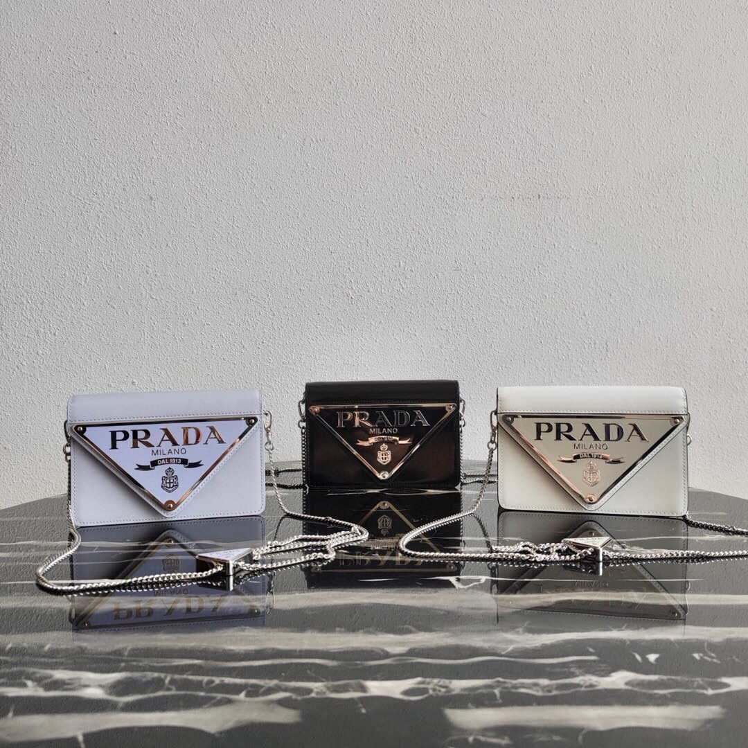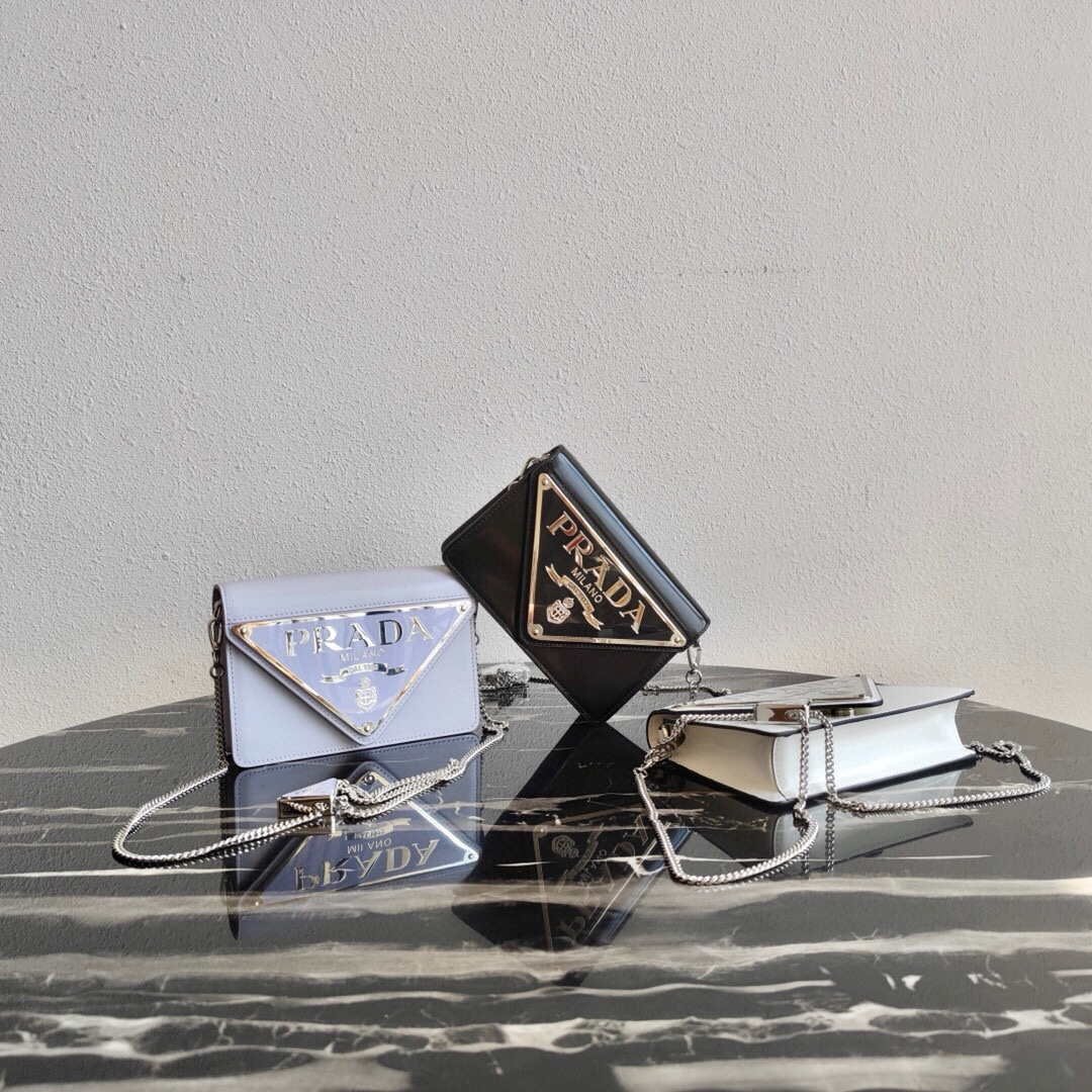 First introduced on the trunks designed by Mario Prada. the triangle is reinterpreted collection after collection through different stylistic codes that inspire new geometric shapes and take on conceptual meanings. This sleek shoulder bag is decorated with the enameled metal maxi logo that gives the accessory an iconic. modern tone.