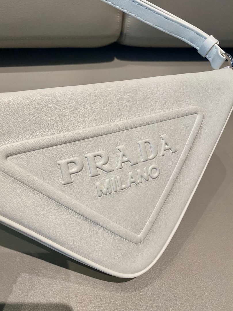 Prada 1NQ043 Triangle leather pouch White on sale now.