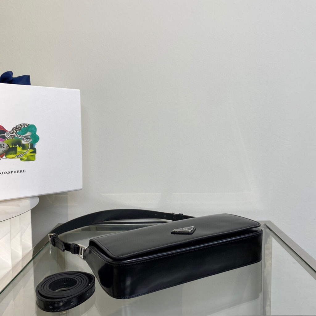 Minimalist elegance. a distinctive character and versatility meet in this shoulder bag with flap that reinterprets the geometric shape of the ’90s in a modern. current way. Made of fine brushed leather. an iconic material of Prada collections. the design with a horizontal line features a narrow adjustable shoulder strap that allows it to be worn as a crossbody or shoulder bag. The rectangular silhouette is decorated with the emblematic enameled metal triangle logo.