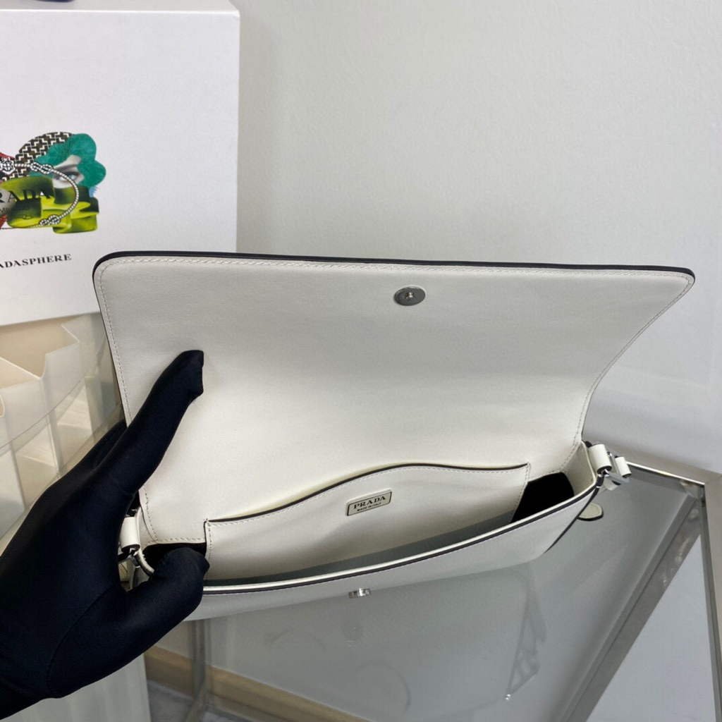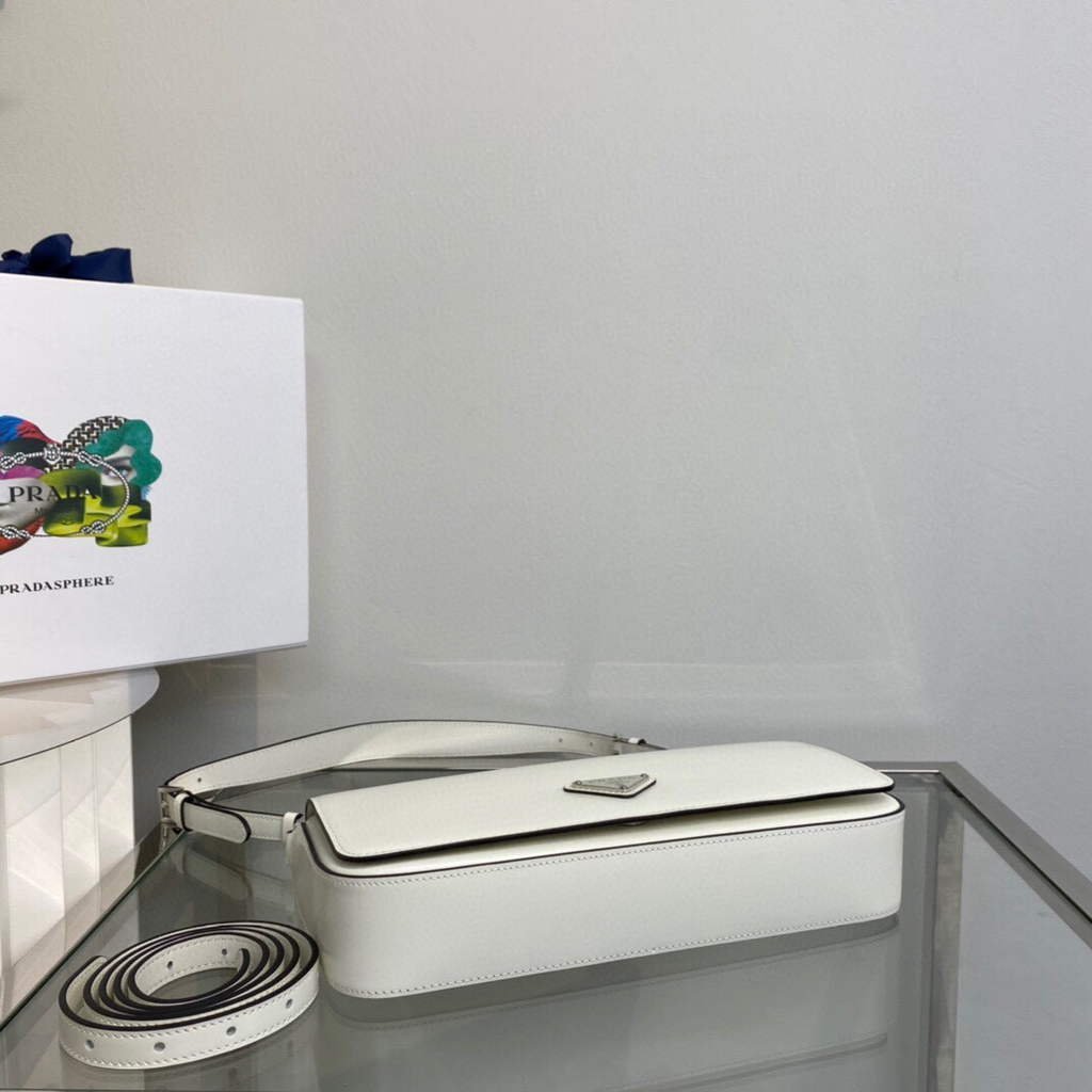 Minimalist elegance. a distinctive character and versatility meet in this shoulder bag with flap that reinterprets the geometric shape of the ’90s in a modern. current way. Made of fine brushed leather. an iconic material of Prada collections. the design with a horizontal line features a narrow adjustable shoulder strap that allows it to be worn as a crossbody or shoulder bag. The rectangular silhouette is decorated with the emblematic enameled metal triangle logo.