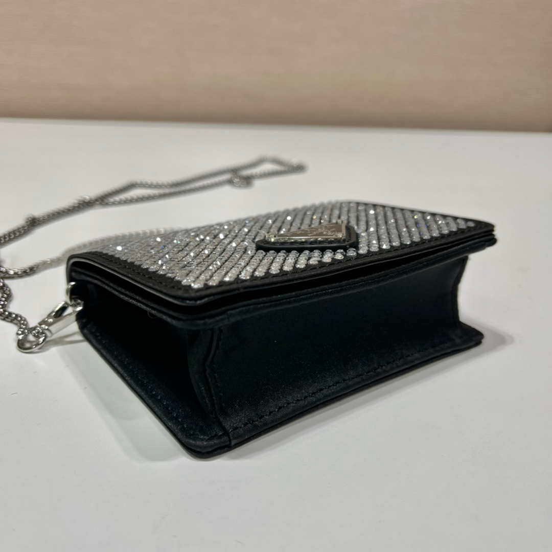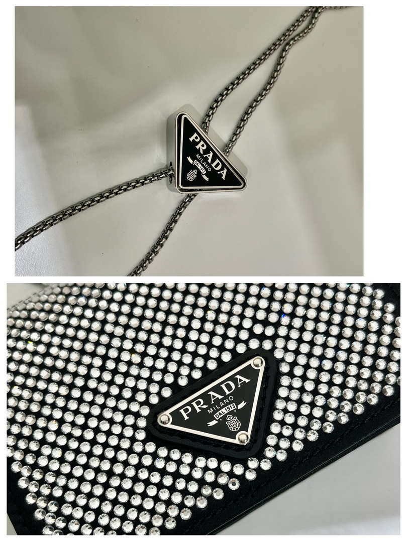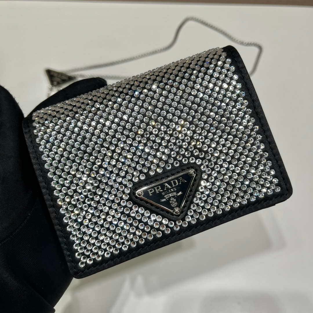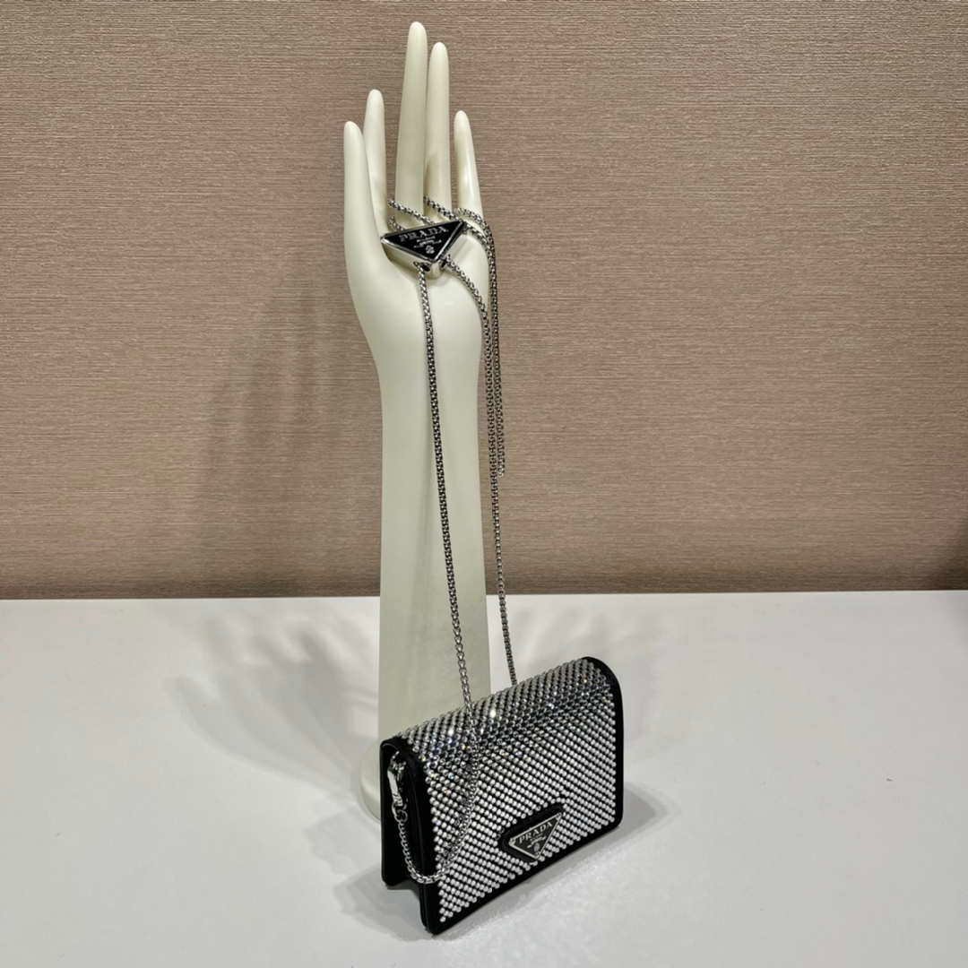 You will get an AAAAA quality knockoff Prada Crystal-studded card holder with shoulder strap 1MR024 Black Crystal with the best price. 1:1 made as the original. If you are not satisfied with the product you received. please be sure to contact us. we promise to solve the problem for you. We are confident that you will adore our products and that we can establish a long-term business relationship with each other.